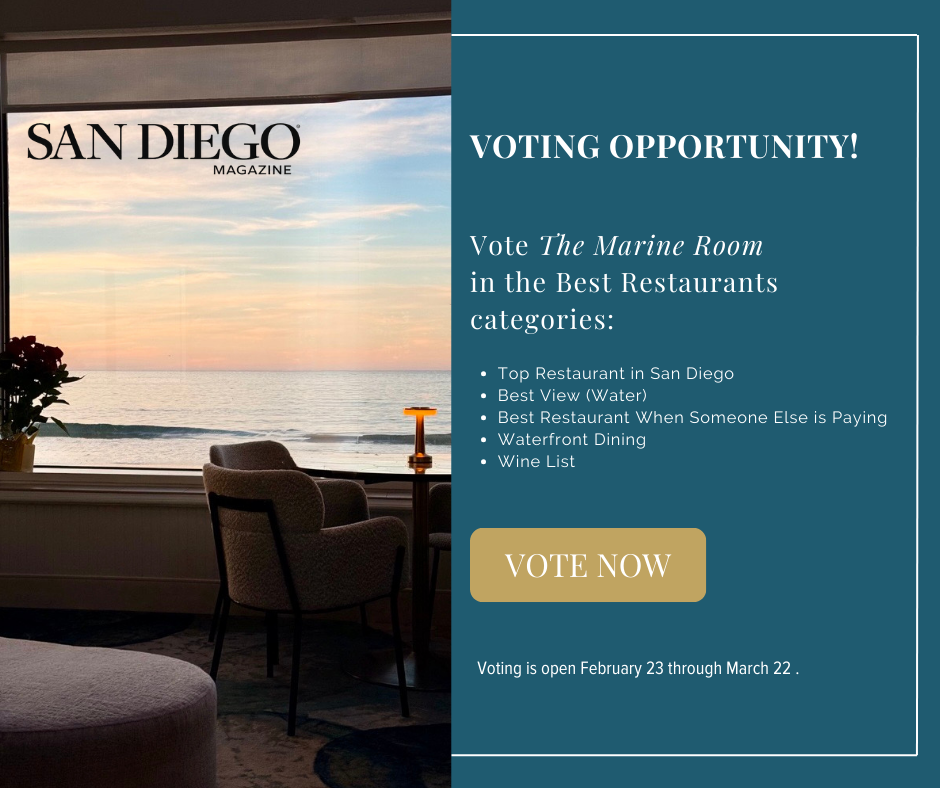 For groups of 20 guests or fewer, please contact the Marine Room directly at 858.459.7222.